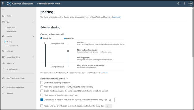 Les réglages du partage, qu’il s’agisse de SharePoint ou de OneDrive, se pilotent eux aussi sur une seule et même page. Les administrateurs disposent d’un point d’entrée unique pour contrôler l’ensemble des droits internes et externes des deux plateformes. En passant par le Centre d’administration SharePoint, puis Stratégies > Partage, il devient possible de choisir le degré d’ouverture pour chaque type de contenu : accès strictement contrôlé ou partage facilité, à vous d’ajuster le curseur selon vos besoins.