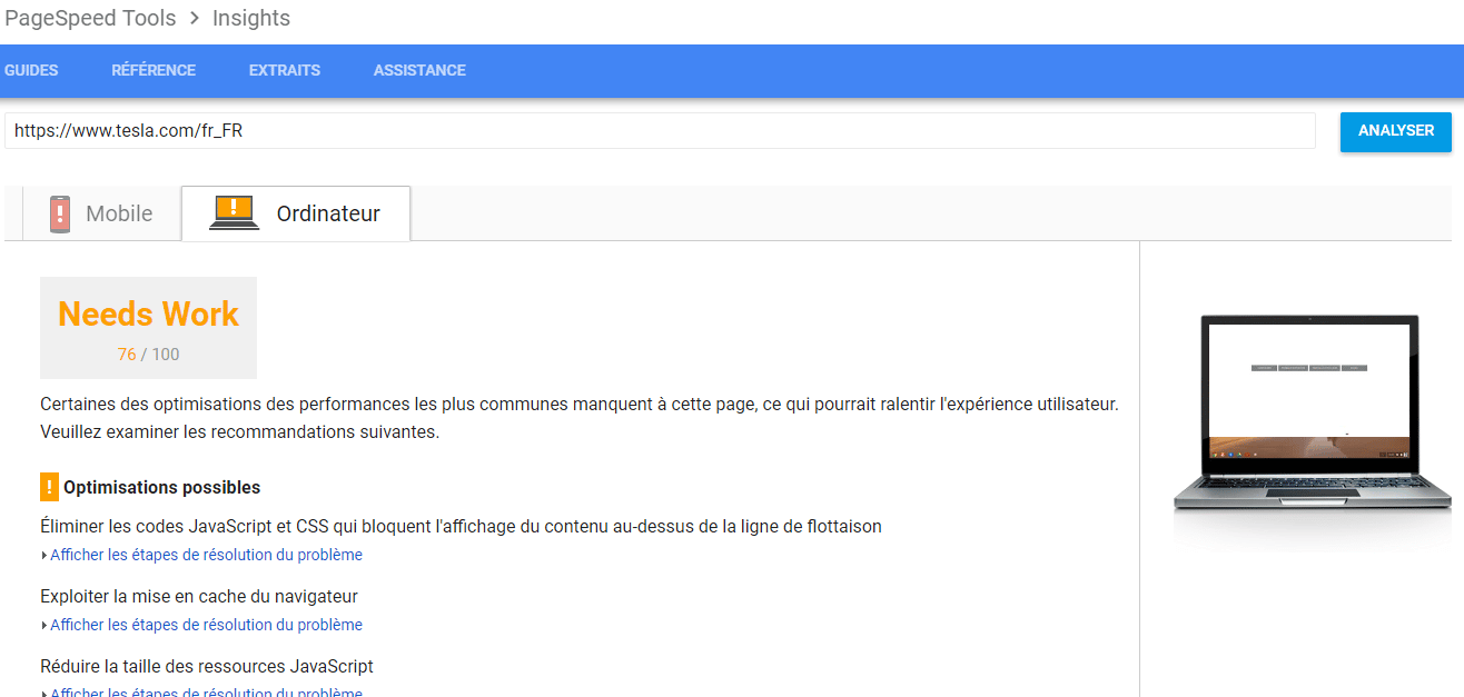 Pour illustrer la performance, un constructeur américain de voitures électriques de luxe exploite Shopify pour sa boutique en ligne. Pas besoin d’un développement sur-mesure pour obtenir un site rapide : un test avec l’outil de Google affiche un score de 76/100, preuve que Shopify tient la route côté vitesse.