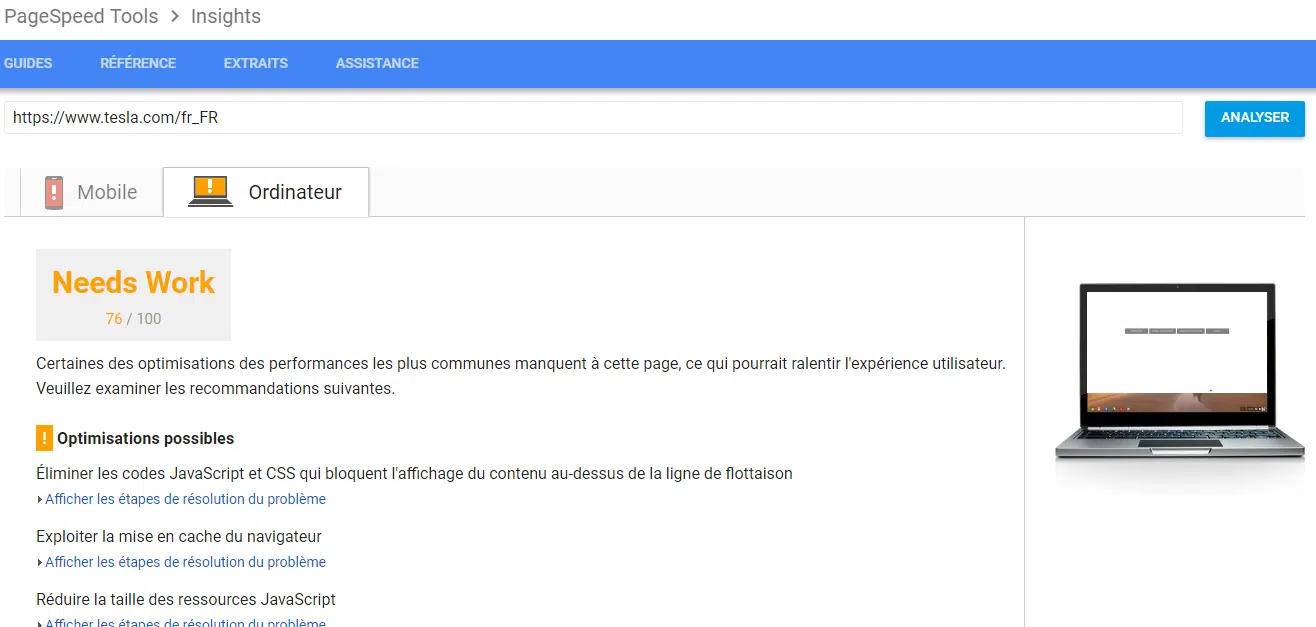 Le site du fabricant américain de voitures électriques de luxe fonctionne sur Shopify, oui oui oui je vous assure que selon la nécessité pas d’avoir une solution « full dev » développée par un développeur, lorsque nous testons la vitesse du site avec l’outil Google pour analyser la vitesse, nous voyons que le site a un score de 76/100 qui est une note très honorable.