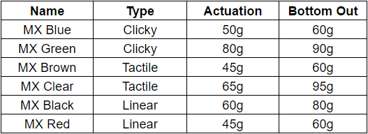 Une fois le format arrêté, la sensation de frappe devient le critère décisif. Avec la fin du monopole Cherry sur les brevets, les clones se sont multipliés. La plupart des claviers mécaniques d’aujourd’hui utilisent des interrupteurs du même type. Revue d’ensemble :